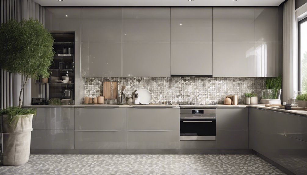 Aby dopasować płytki do Twoich szarych mebli kuchennych, zacznij od określenia odcienia szarości, który masz — chłodny czy ciepły. Jeśli Twoje meble są w chłodnym odcieniu szarości, rozważ płytki w kolorach białym lub niebieskim, podczas gdy ziemiste tonacje dobrze współgrają z ciepłym szarym. Wybierz trwałe materiały takie jak porcelana lub ceramika dla praktyczności. Wprowadź ciekawą wzorzystość lub tekstury, aby stworzyć głębię. Zwróć uwagę na oświetlenie; błyszczące płytki mogą rozjaśnić przestrzeń, podczas gdy matowe opcje oferują przytulność. Na koniec pomyśl o rozmiarach płytek, aby podkreślić charakter Twojej kuchni. Kontynuuj odkrywanie wskazówek projektowych, aby zapewnić spójny i stylowy wygląd kuchni.