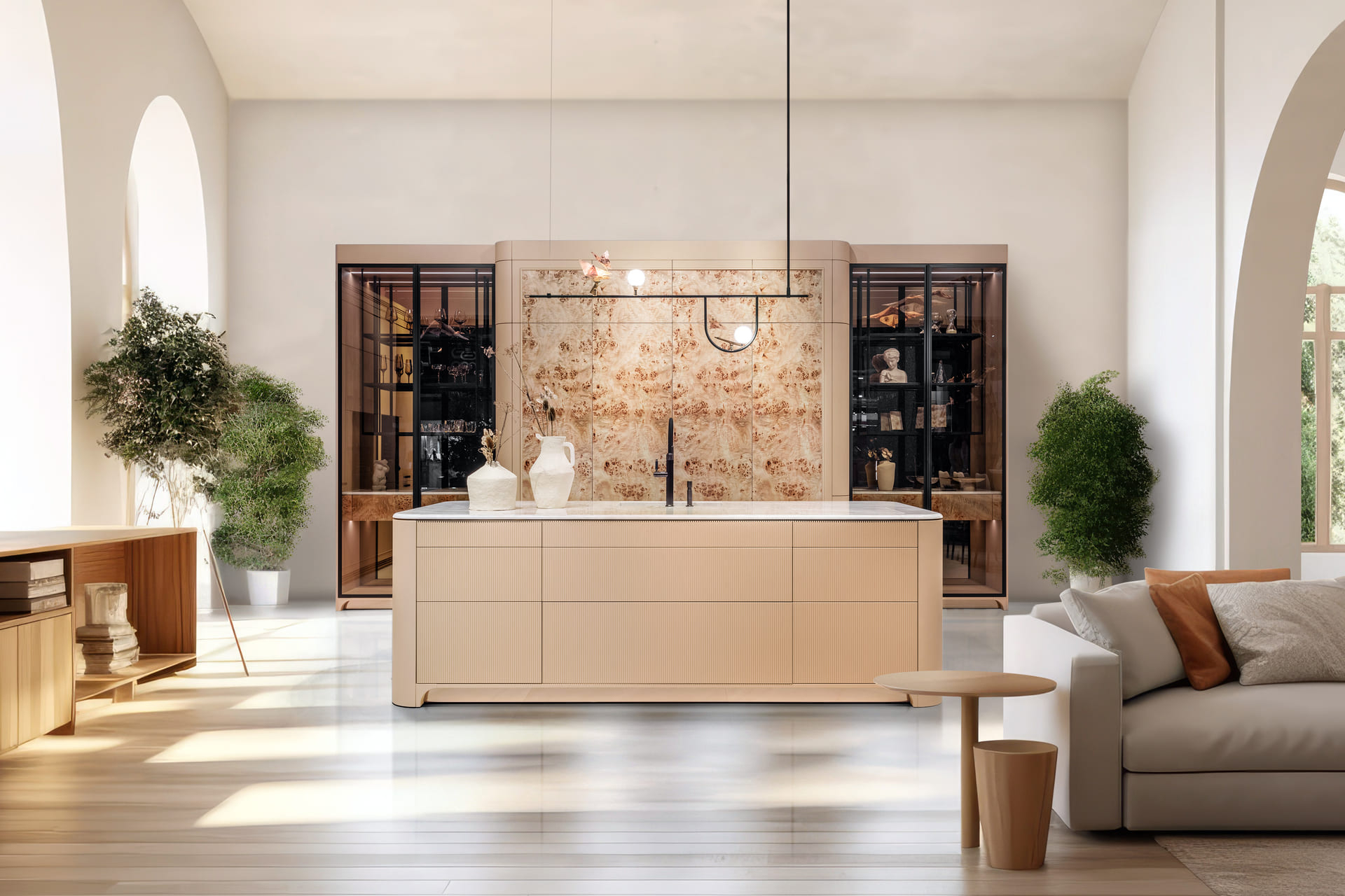 Pojęcie „emocjonalnej trwałości” (emotional durability) coraz śmielej wkracza do świata designu. Zakłada ono, że przedmiotów, z którymi nawiązujemy relację i które starzeją się z godnością, nie wyrzucamy. W kontekście zabudowy kuchennej oznacza to zwrot ku materiałom, które opierają się upływowi czasu, a wręcz zyskują na szlachetności wraz z kolejnymi latami eksploatacji. W segmencie luksusowym nie ma miejsca na imitacje. Jeśli projekt zakłada obecność kamienia, musi to być naturalny kwarcyt, granit lub marmur, ze wszystkimi swoimi „niedoskonałościami” – żyłowaniem, mikropęknięciami czy zmienną kolorystyką. To właśnie te unikalne cechy stanowią o wartości materiału, czyniąc go niepowtarzalnym dziełem natury, niemożliwym do skopiowania w fabryce laminatów. Podobnie rzecz ma się z drewnem. Selekcjonowane forniry, często dobierane z jednej kłody w celu zachowania ciągłości rysunku na całej ścianie meblowej, wprowadzają do wnętrza ciepło i organiczną energię.